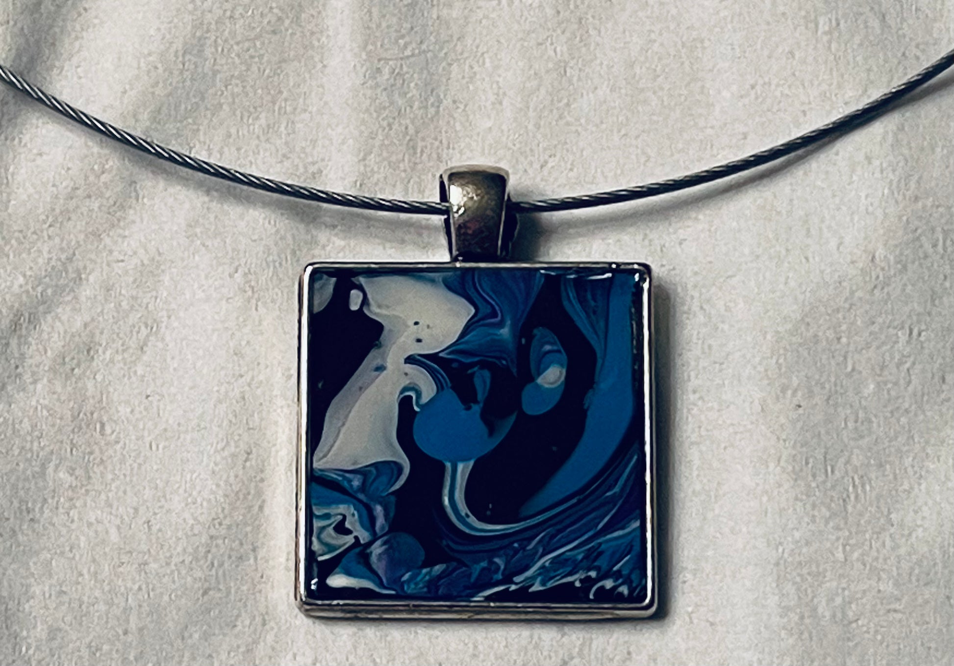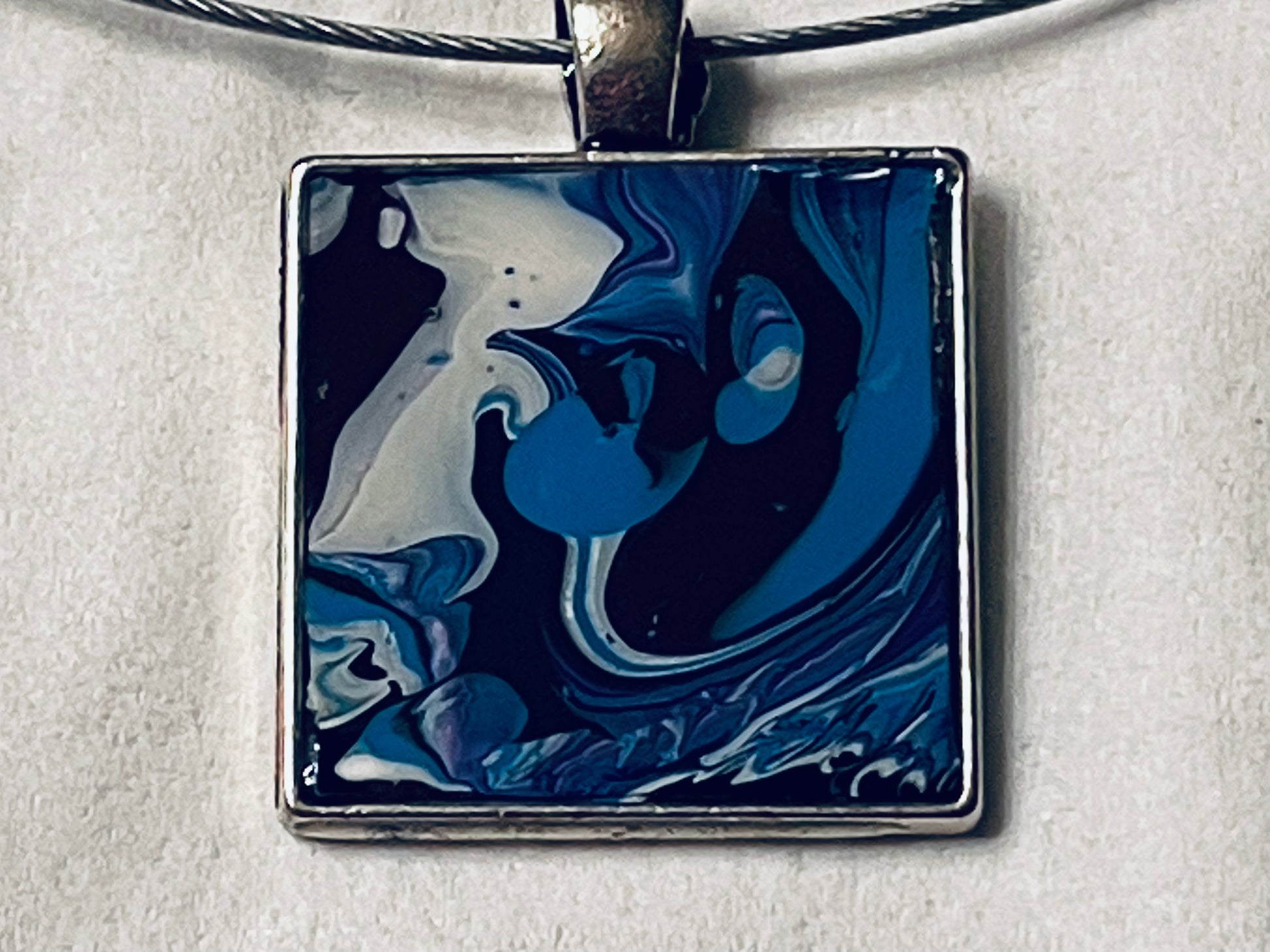 Beautiful blue acrylic waves adorn this blue square setting. The pour is sealed. Resin to protect the paint from the elements and yellowing. This is from a previous pour on my artist table. Pictured with a choker and necklace. Comes with either the choker or necklace and in a pouch.